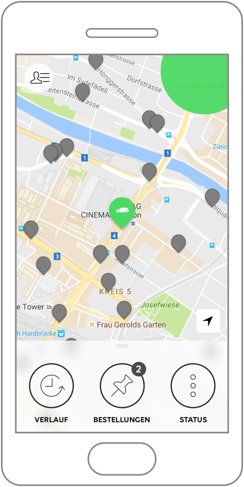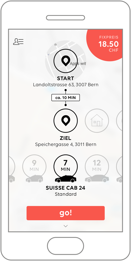 Ziel war es den ganzen Prozess, von Bestellung bis Bezahlung, für den Nutzer so einfach wie möglich zu gestalten. Florian Gygax, Lead-Designer in diesem Projekt, erinnert sich: «Wir wollten, dass man die App mit einer Hand bedienen kann». Das macht natürlich Sinn: Eine Taxi-App wird meistens unterwegs gebraucht – und da hat man oft zum Beispiel eine Tasche oder einen Schirm in der Hand.