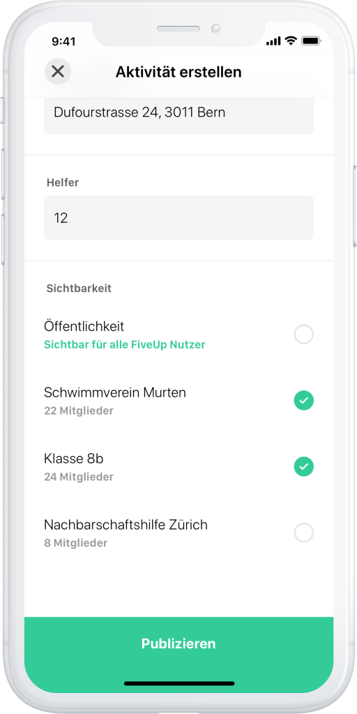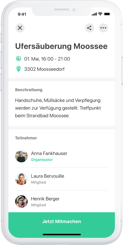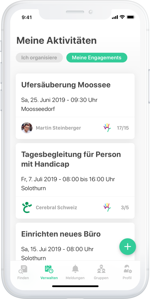 - Ihr könnt sinnvolle Aktivitäten in der App direkt auf euren Kanälen via Whatsapp, Facebook, Instagram etc. teilen, damit die Chance grösser wird, Hilfe zu vermitteln. Dazu gibt es im Detail der Aktivität oben rechts das «Teilen» Zeichen.