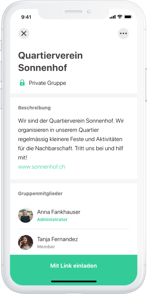 - In der App kann man bei «Community» eigene Gruppen erstellen und Kontakte dazu einladen. So kann man Quartiergruppen, Familiengruppen etc. bilden.