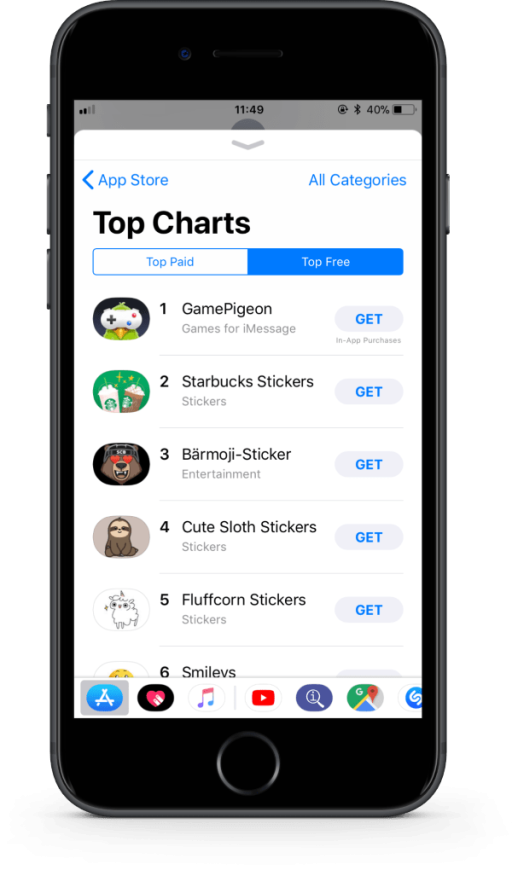 iMessage startete sogar eine eigene Version eines App Stores, und Marken haben da nun einen zweiten Platz (zusätzlich zu ihrer eigenen Emoji-Tastatur), in dem ihre Emoji-Inhalte publiziert werden können, was bedeutet, dass noch mehr Wert aus jedem einzelnen Emoji erzielt werden kann. Kleiner Hinweis: Emojis werden übrigens bei iMessage “Stickers” genannt.
