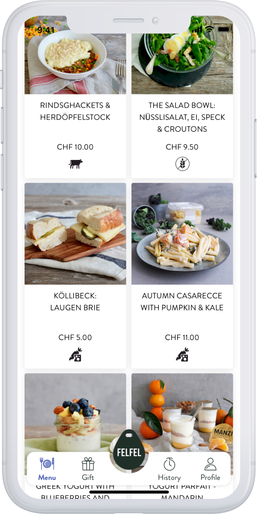 The app provides access to the interactive fridge that contains fresh and healthy meals at any time. Through the app employees can always keep an eye on all the meals that are currently available, their transactions and much more. The dishes are prepared and delivered by partner chefs from small family businesses on behalf of FELFEL.